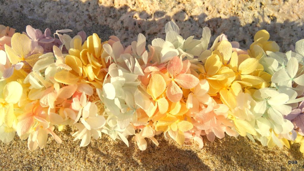ハワイではレイを贈る時、お祝いのシーンが多く、結婚式、誕生日、卒業式、そして何かの記念日等、メモリアルとしてのレイ。